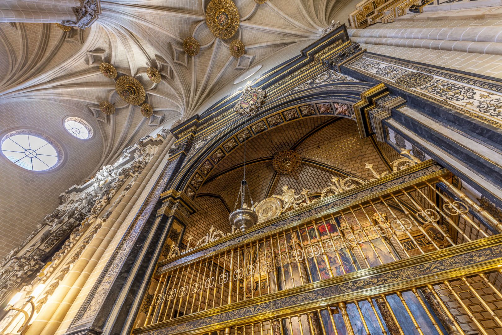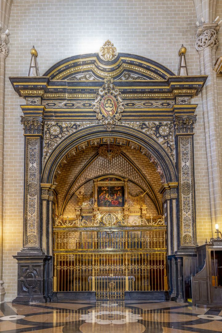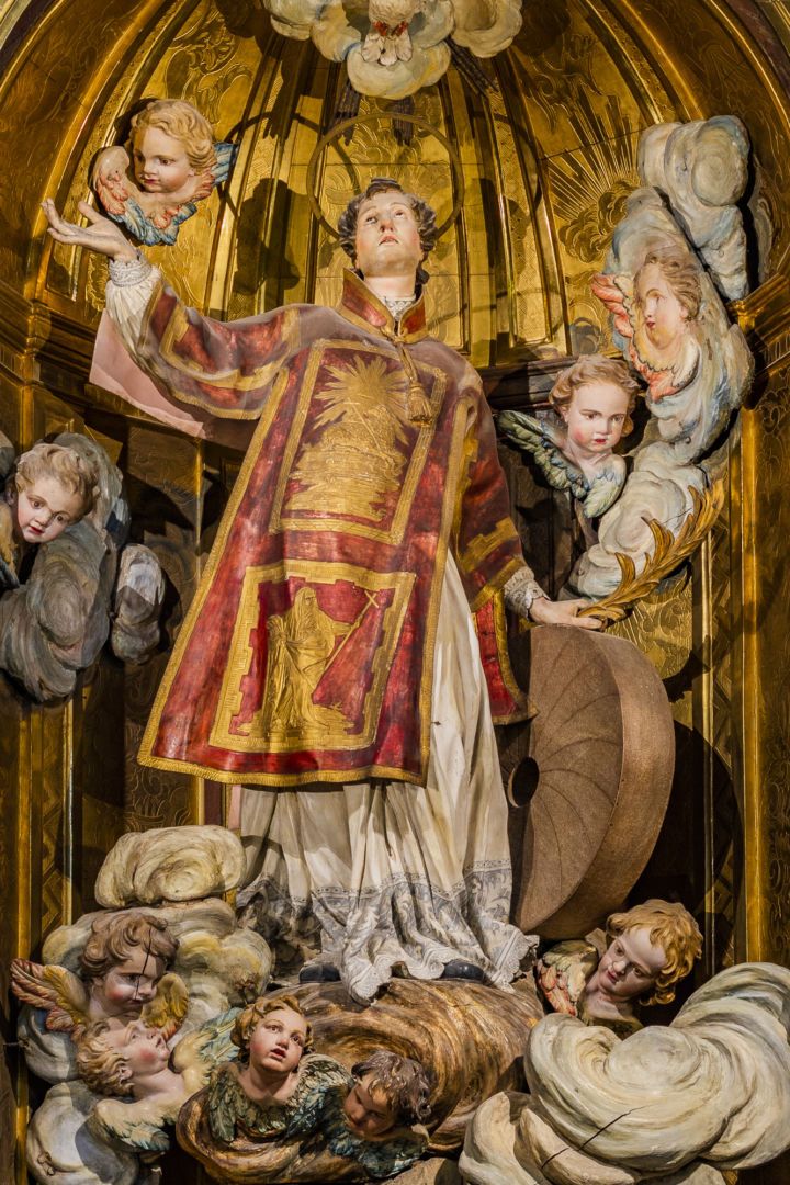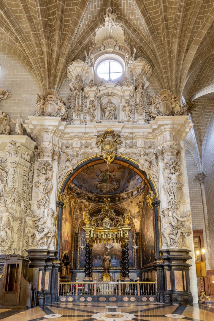 Llama también la atención el baldaquino barroco de columnas salomónicas, inspirado en el de la Basílica de San Pedro del Vaticano.