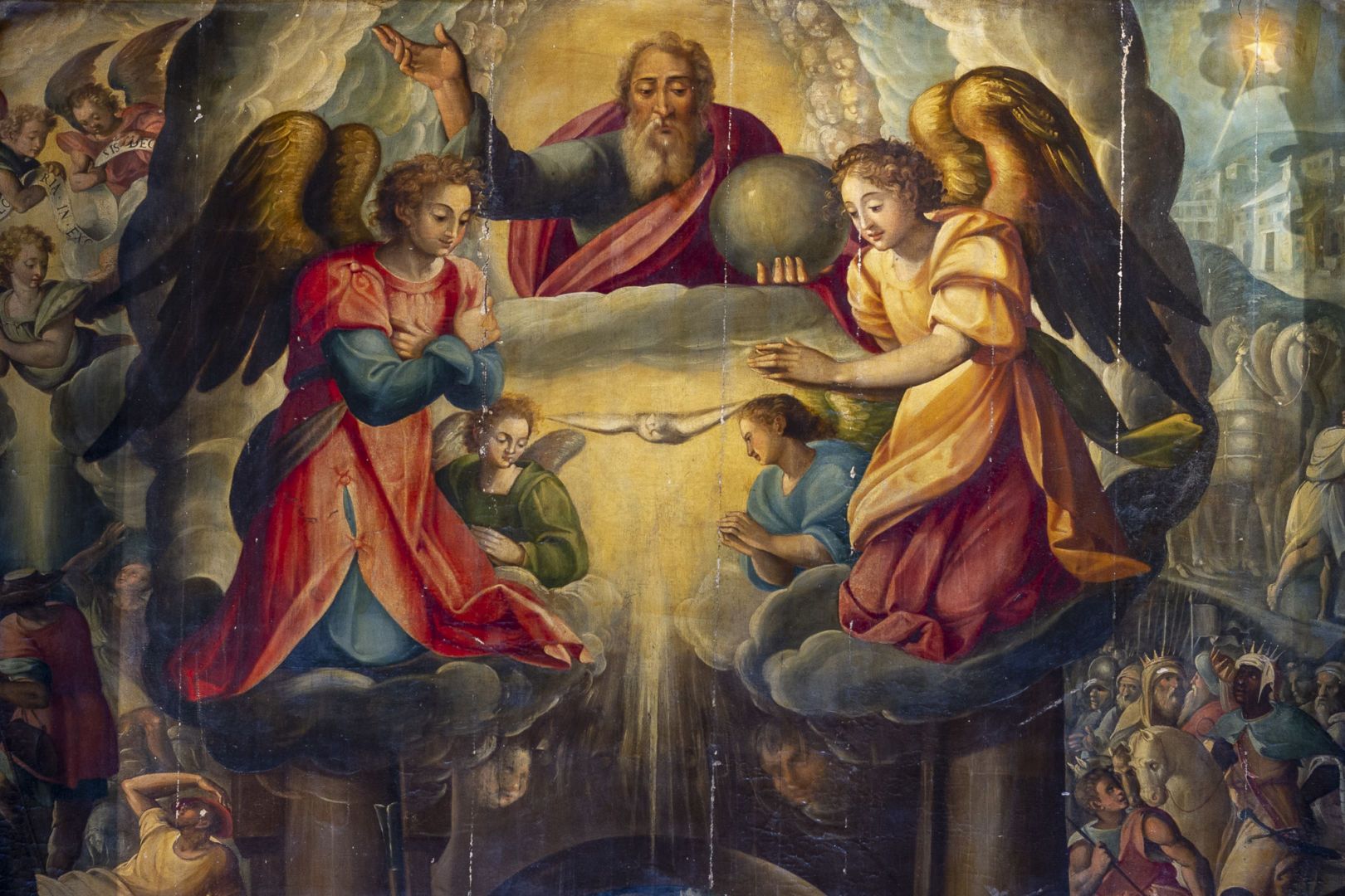 En la calle central del cuerpo principal del retablo destacan los relieves de las virtudes: Prudencia, Caridad, Fe y Esperanza.